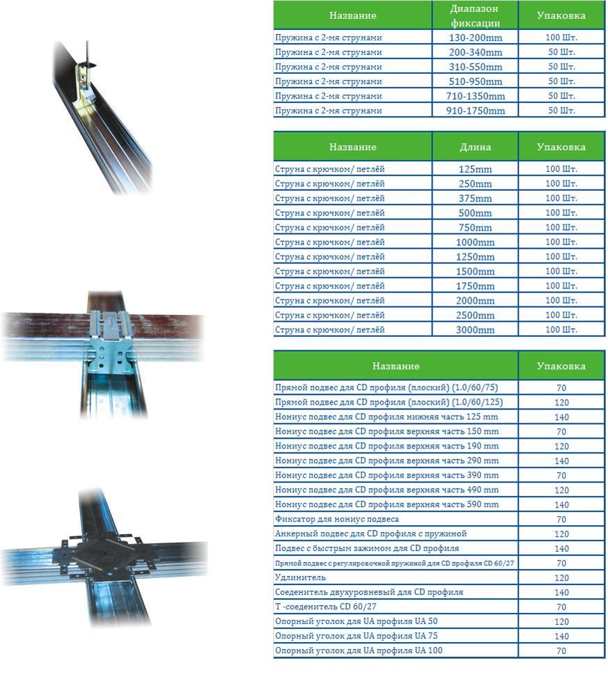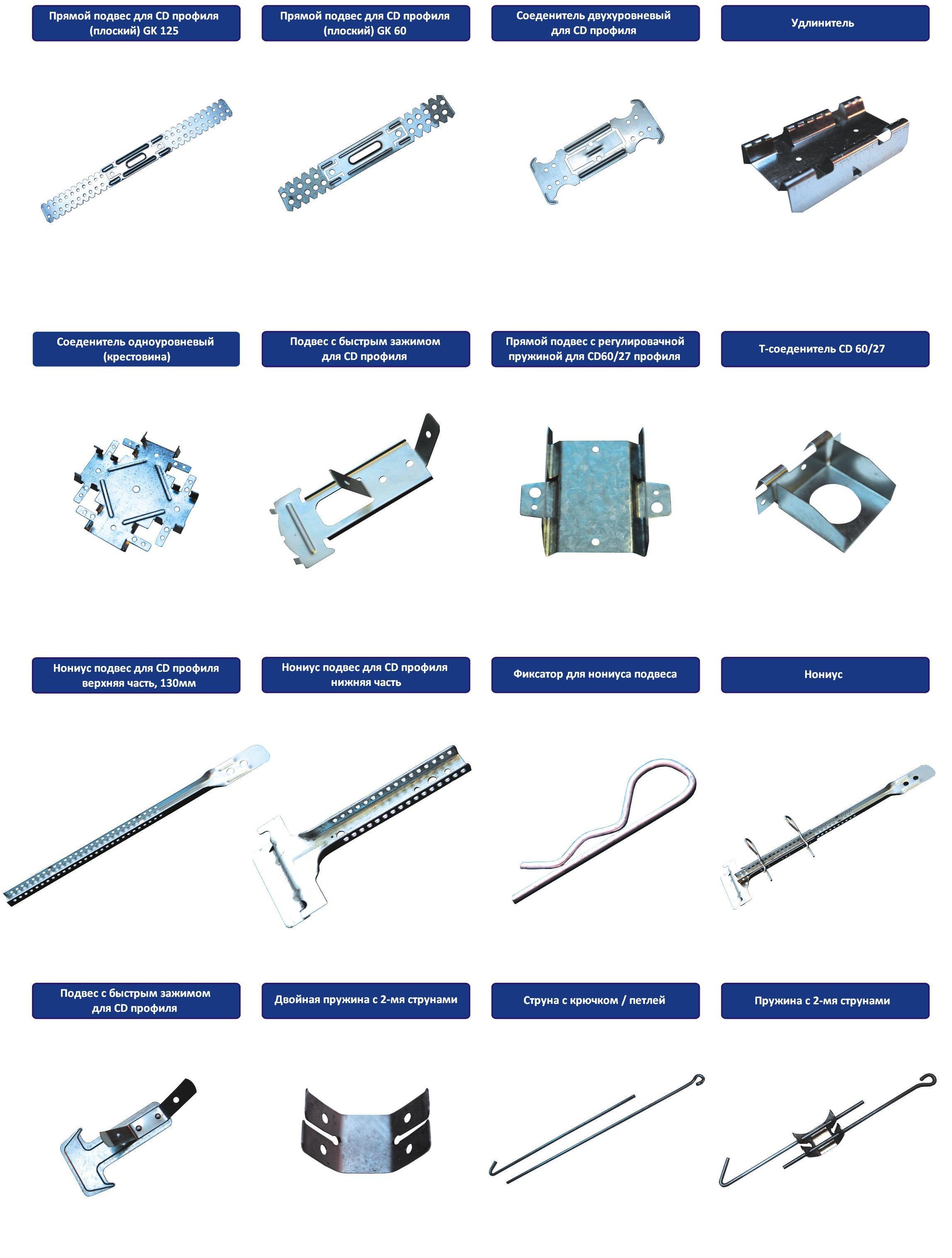 Элементы крепления — прямой подвес, соединитель, подвес с зажимом, удлинитель, тяга для
